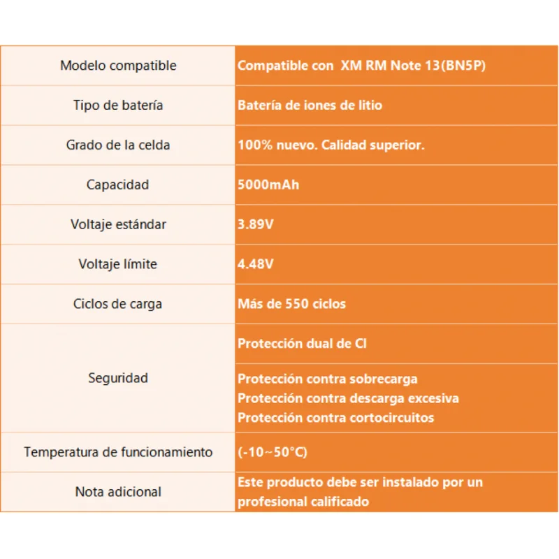 Batería de reemplazo BN5P compatible con Xiaomi Redmi Note 13, ideal para devolverle al equipo su autonomía original. Fabricada por ORYRO, ofrece excelente estabilidad, larga duración y protección contra sobrecargas y sobrecalentamiento.