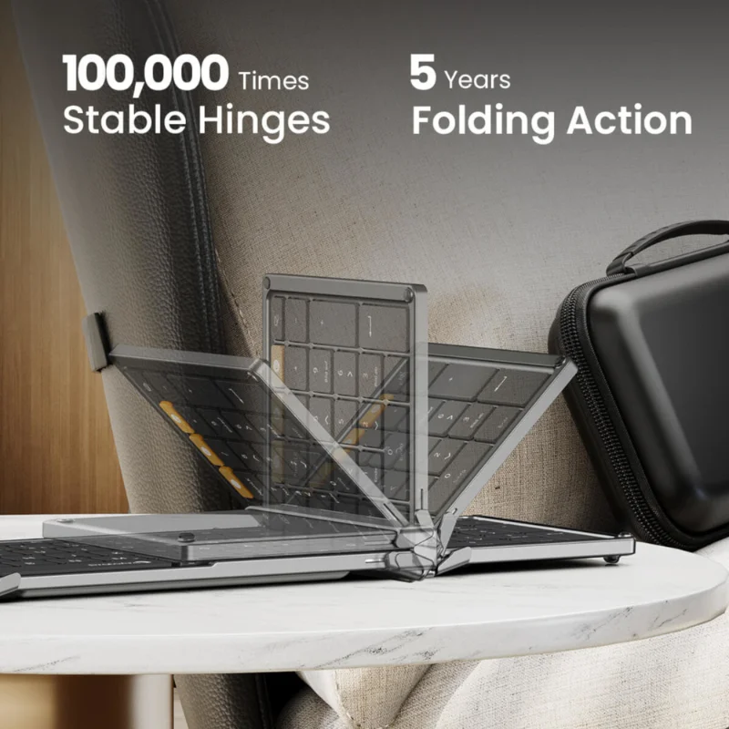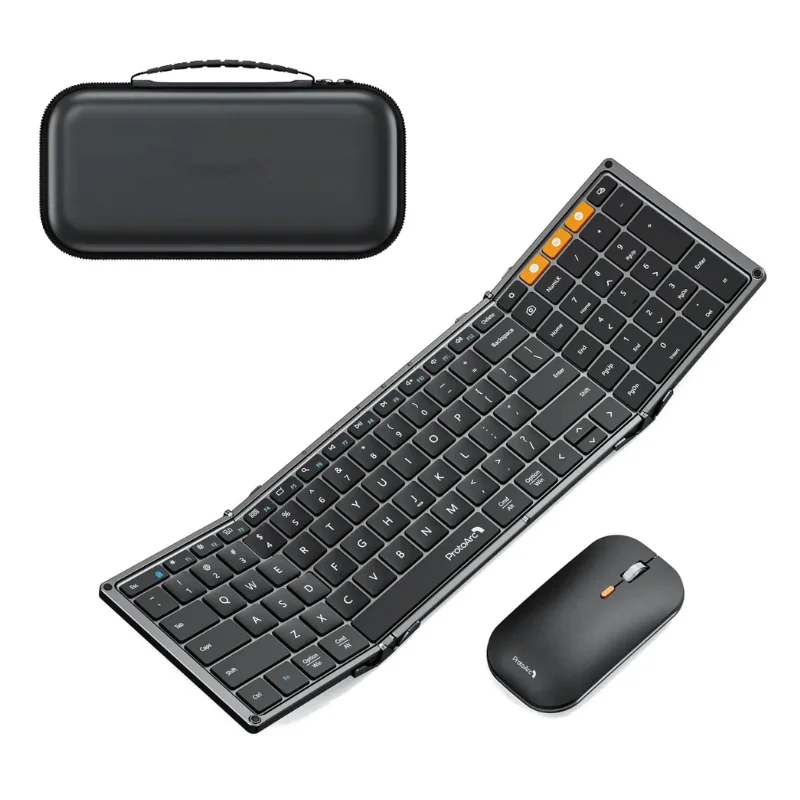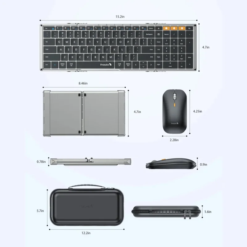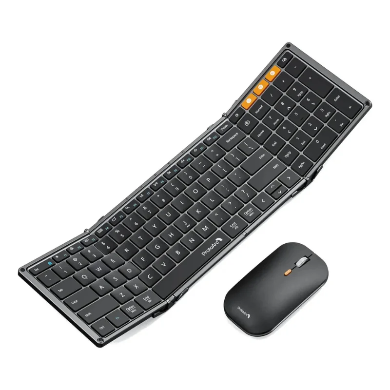 Combo inalámbrico, teclado y mouse ProtoArc ideal para viajeros o quienes trabajan desde distintos lugares. Su teclado plegable de triple pliegue ofrece comodidad y portabilidad sin perder el formato completo de escritura. Incluye un mouse con tres niveles de sensibilidad para una experiencia de uso fluida y precisa.