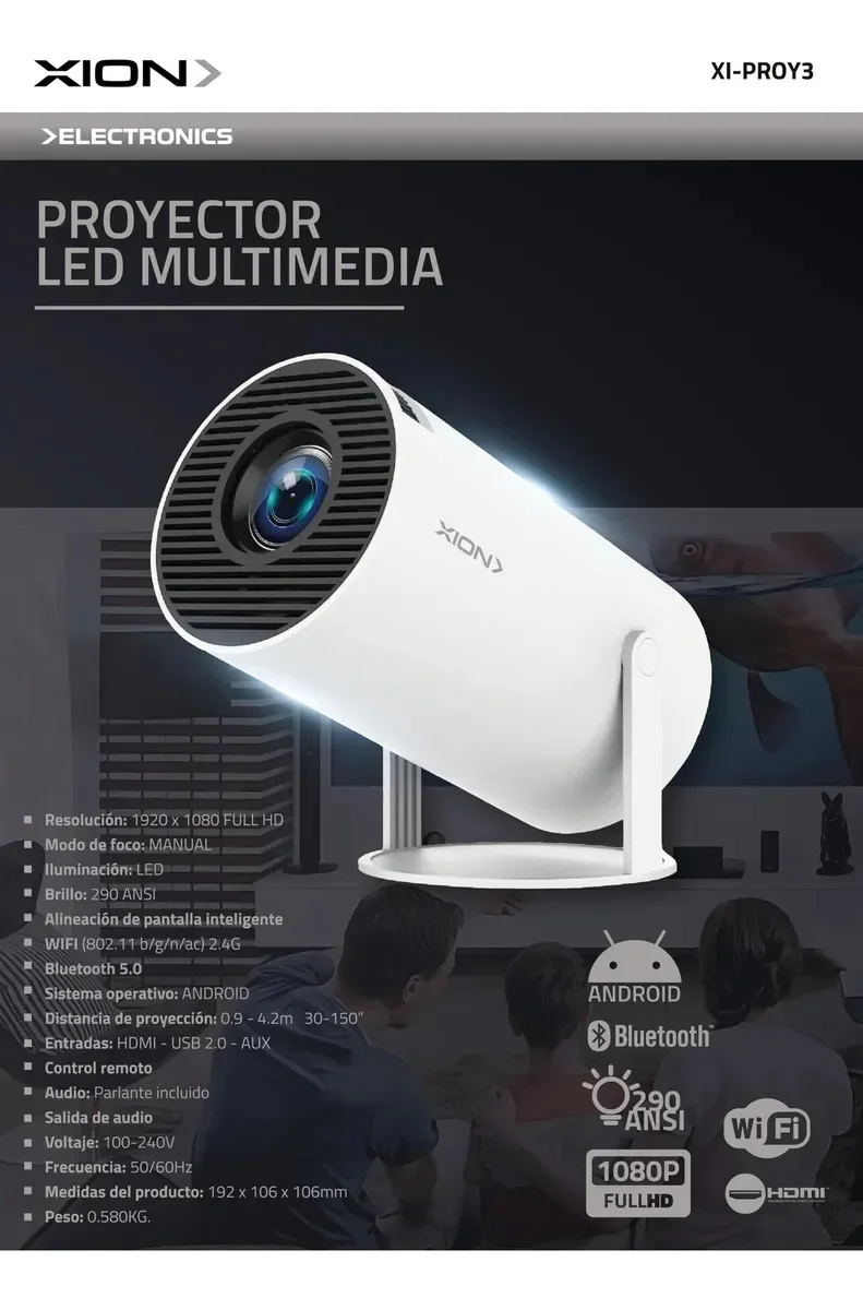 Proyector Smart LED Xion modelo XI PROY3. Ideal para disfrutar películas, series, partidos o presentaciones con excelente calidad de imagen en cualquier espacio.