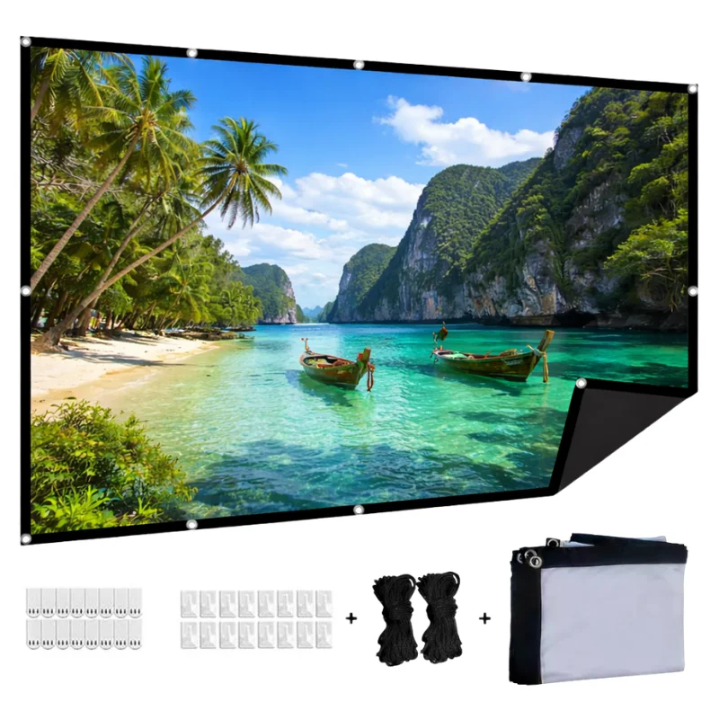 Formato 16:9 que se adapta perfectamente a contenido moderno como Netflix, YouTube, streaming, consolas y notebooks. Diseño portátil liviano y plegable fácil de guardar y transportar. Se puede instalar en pared techo o exterior mediante ojales reforzados que brindan firmeza y estabilidad.