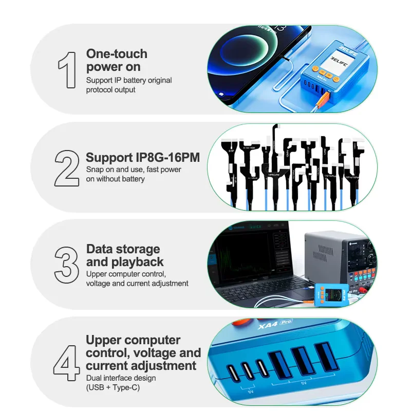 El cable de alimentación y encendido rápido RELIFE para la fuente XA4 Pro está diseñado para uso profesional en talleres de reparación de celulares, especialmente para pruebas de pantallas y encendido de equipos sin necesidad de instalar la batería original. Cuenta con función one-touch power on, permitiendo encender el dispositivo con un solo toque mientras reproduce el protocolo original de batería en iPhone, lo que asegura pruebas estables y seguras durante diagnósticos técnicos. Este cable trabaja en conjunto con sistemas de control desde computadora, permitiendo ajuste de voltaje y corriente, almacenamiento y reproducción de datos de prueba, así como actualizaciones de firmware del sistema. Esto facilita diagnósticos precisos, repetibles y controlados en procesos de testeo intensivo. Integra una pantalla HD de 2 pulgadas que muestra en tiempo real parámetros clave como curva de consumo, voltaje, corriente y potencia, brindando al técnico información clara y rápida para detectar anomalías en el funcionamiento del equipo. Su diseño de expansión continua incorpora interfaz dual USB y Tipo-C, compatible con salidas de alto voltaje y módulos adicionales, ofreciendo alta compatibilidad y facilidad de actualización para adaptarse a futuras necesidades del taller. La construcción del cable está pensada para uso intensivo: fabricado en PVC reforzado, es resistente a tirones, no se enreda fácilmente y soporta largas jornadas de trabajo. Los conectores utilizan cobre libre de oxígeno, proporcionando excelente conductividad, alta resistencia a la oxidación y mayor durabilidad en entornos técnicos exigentes. Es un accesorio indispensable para técnicos que utilizan la fuente XA4 Pro y necesitan realizar pruebas de encendido, consumo y funcionamiento de pantallas de forma rápida, segura y profesional en reparaciones de iPhone y dispositivos compatibles. Características principales