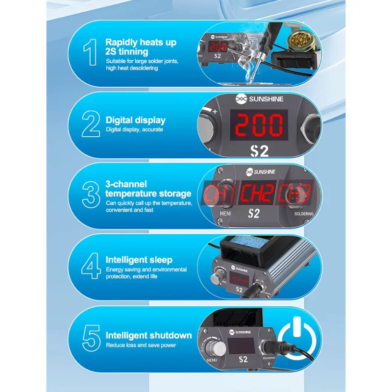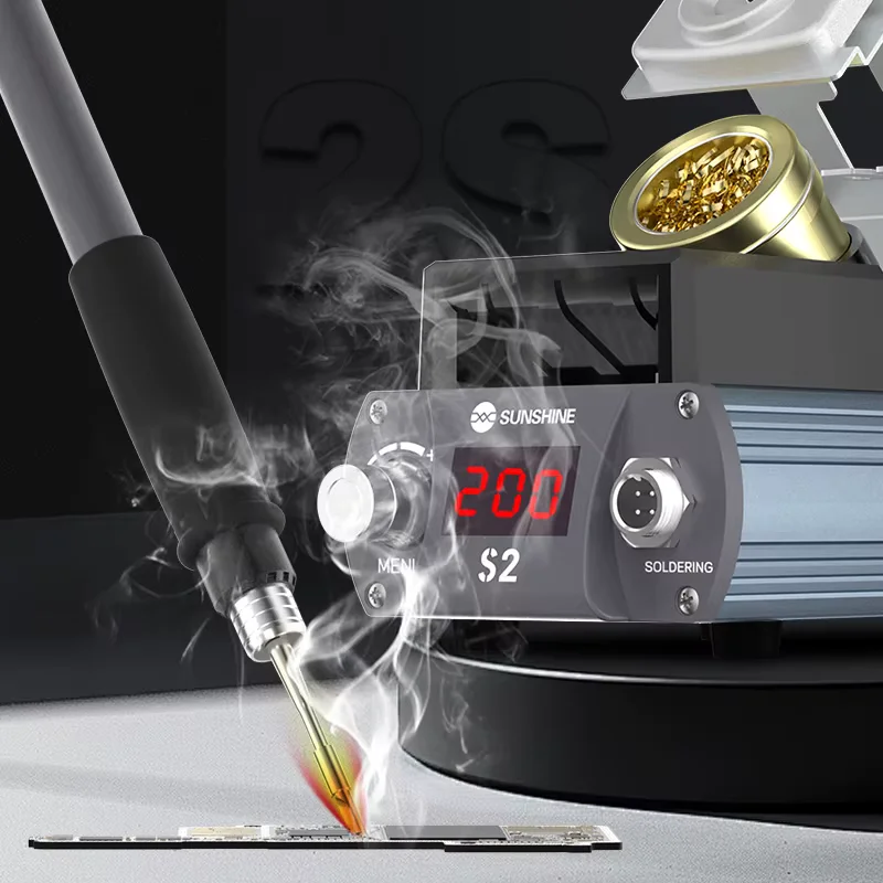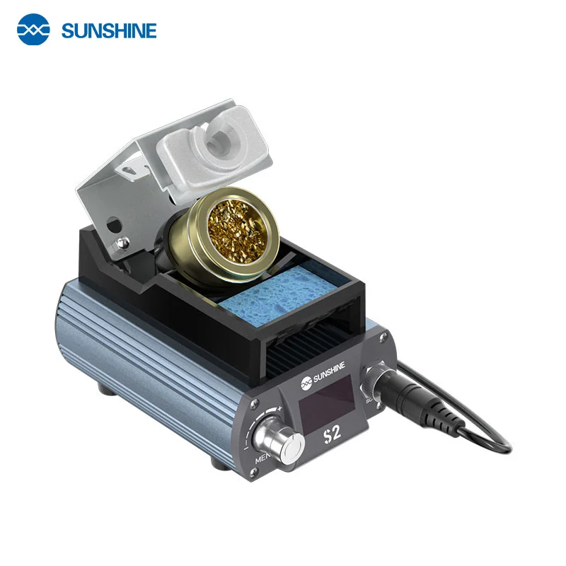 La SUNSHINE S2 Smart Soldering Station es una estación de soldadura profesional diseñada para trabajos de microsoldadura de alta precisión, ideal para reparación de celulares, placas PCB y microelectrónica. Gracias a su sistema compatible con puntas C210 con calefactor integrado, ofrece calentamiento ultrarrápido, excelente estabilidad térmica y gran eficiencia en la transferencia de calor, permitiendo realizar soldaduras limpias y seguras incluso en componentes muy pequeños.