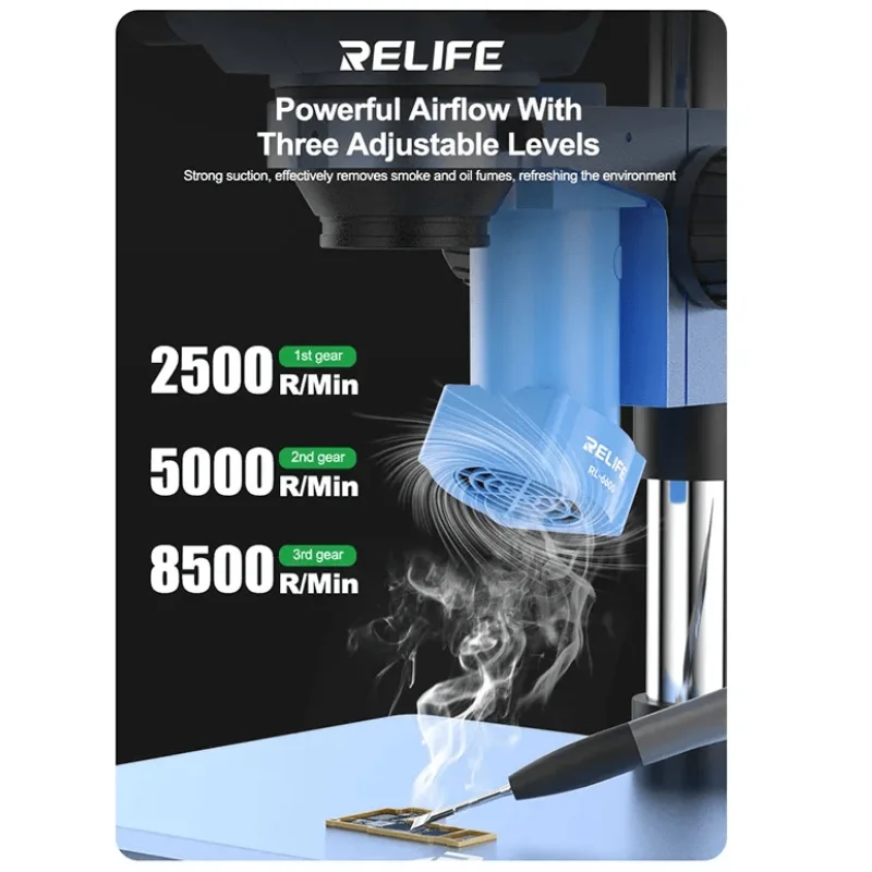 El RELIFE RL-6600 es un extractor de humo diseñado específicamente para trabajos de microsoldadura bajo microscopio, donde la visibilidad y el control del entorno son fundamentales.