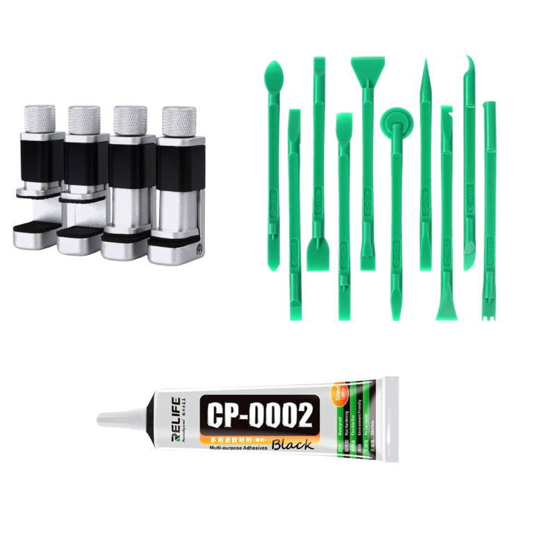 Kit Pegado Y Apertura Espátulas RL-049c Prensas RL-008A Pegamento CP-0002 50mlKit Profesional Relife: Especialista en Pegado y Apertura de Dispositivos