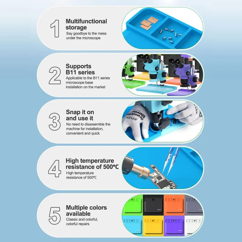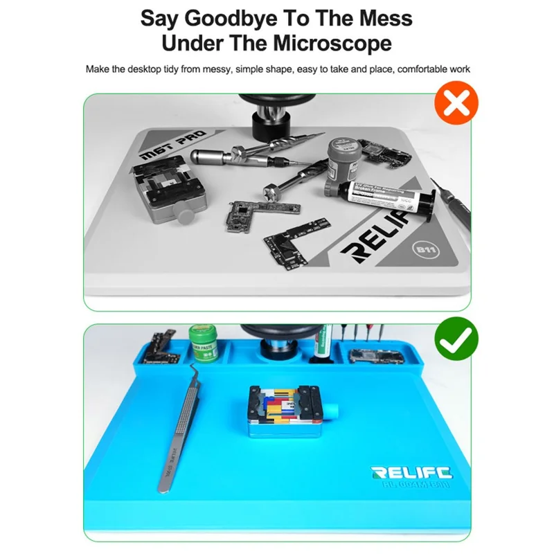 La manta RELIFE de silicona antiestática es una herramienta profesional diseñada para talleres de reparación electrónica y trabajos de microsoldadura. Compatible con las bases del microscopio B1, permite integrarse sin desmontar el equipo, optimizando tiempos y manteniendo un flujo de trabajo continuo.
