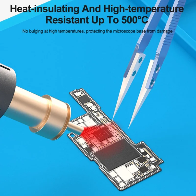 Fabricada en silicona ecológica de alta resistencia térmica, soporta temperaturas de hasta 500 °C sin deformarse. Su superficie antiestática protege los componentes sensibles, mientras que el diseño más grueso y amplio brinda mayor comodidad y espacio operativo durante reparaciones complejas.