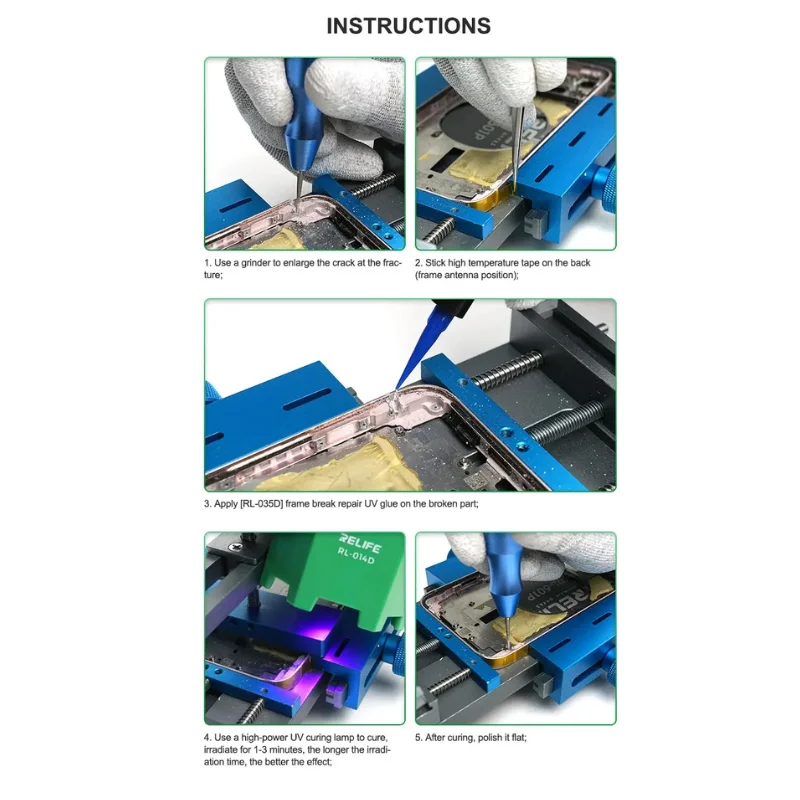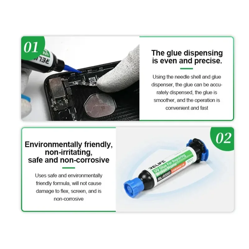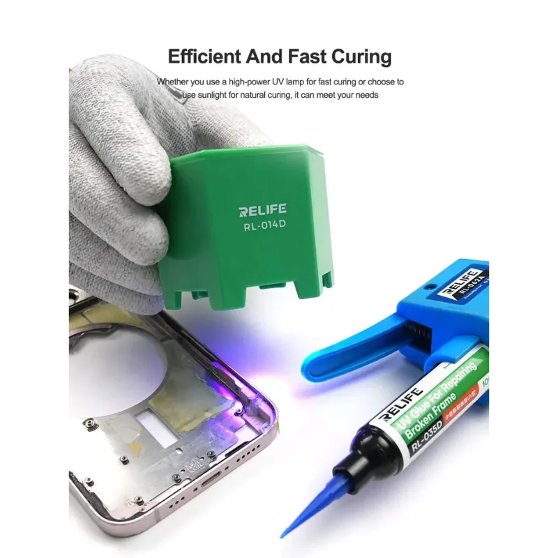 El RELIFE RL-035D es un adhesivo UV profesional desarrollado específicamente para la reparación de marcos rotos, grietas estructurales y zonas debilitadas en celulares y dispositivos electrónicos.