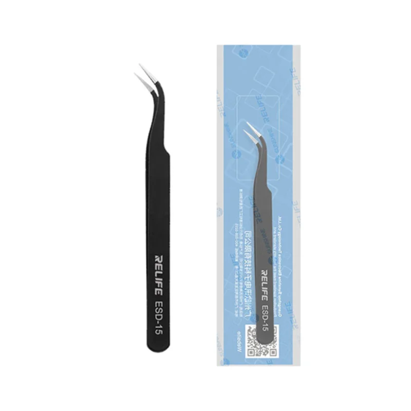 La RELIFE RL-ESD-15 es una pinza de precisión con punta curva, diseñada para manipular componentes electrónicos delicados con máxima exactitud. Su forma curva permite trabajar con mayor comodidad en zonas reducidas de la placa, facilitando la colocación y manipulación de componentes SMD, cables finos y microcomponentes durante procesos de reparación.