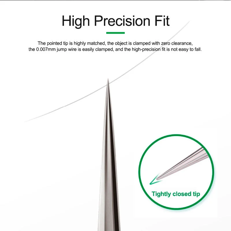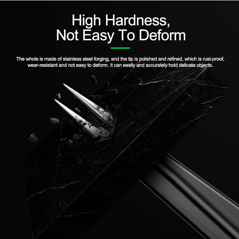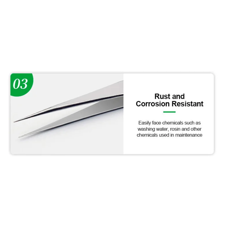 Fabricada en acero inoxidable de alta calidad, ofrece excelente resistencia al desgaste, gran estabilidad y control durante el trabajo. Es una herramienta indispensable en servicios técnicos de celulares, reparación de placas PCB y electrónica de precisión.