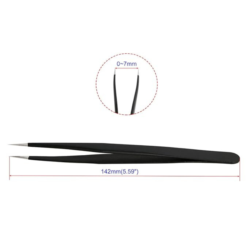 Fabricada en acero inoxidable con recubrimiento antiestático (ESD), ayuda a prevenir descargas electrostáticas que pueden dañar componentes sensibles. Su punta fina y recta brinda gran control durante el trabajo, convirtiéndola en una herramienta esencial para servicios técnicos de celulares, reparación de placas PCB y electrónica de precisión.