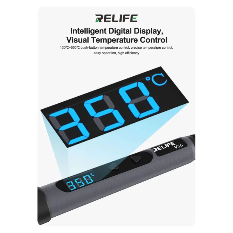 El soldador digital RELIFE 936 es una herramienta de alto rendimiento diseñada para trabajos profesionales de reparación electrónica y microsoldadura. Con una potencia de 90W, ofrece calentamiento rápido y estable, permitiendo realizar soldaduras eficientes en placas de celulares, tablets, notebooks y otros dispositivos electrónicos.