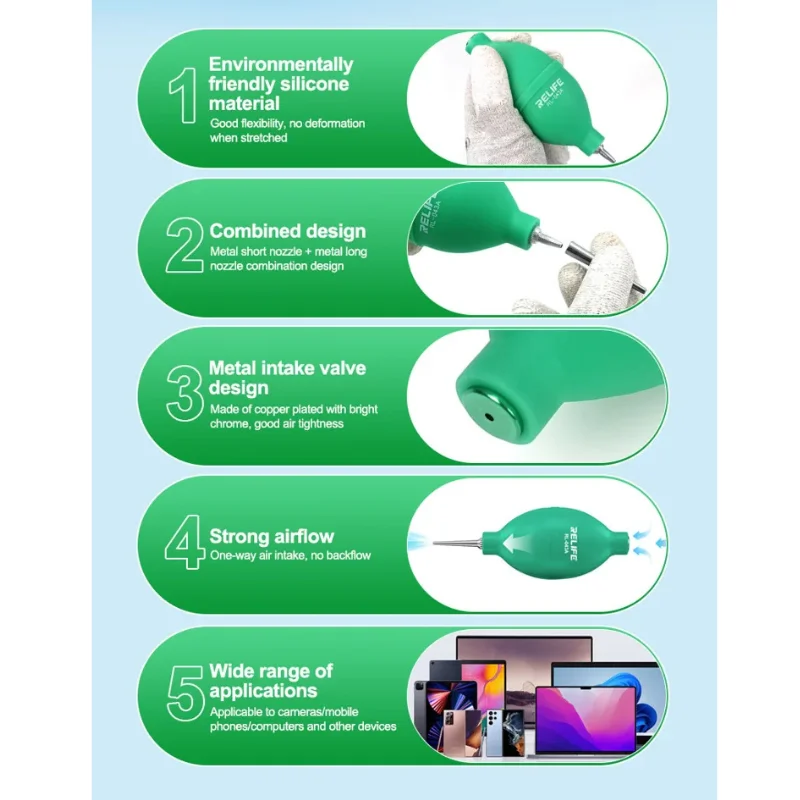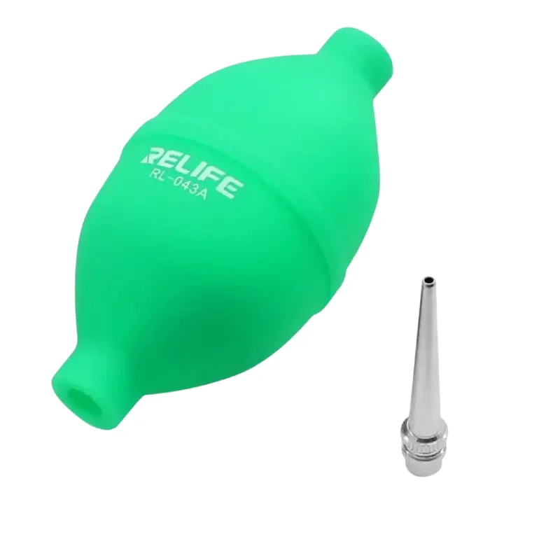El RELIFE RL-043A 2 en 1 Dust Ball es un soplador de aire manual diseñado para limpieza de precisión en trabajos técnicos de electrónica, reparación de celulares y mantenimiento de equipos delicados.