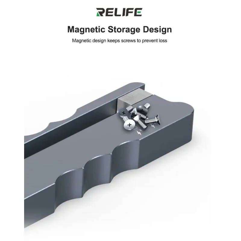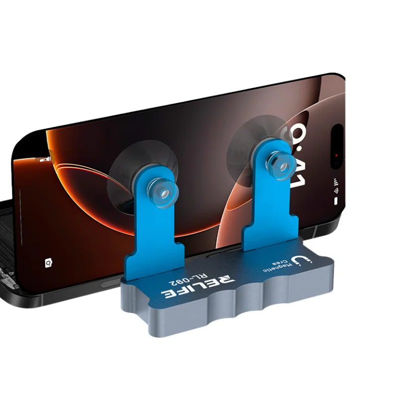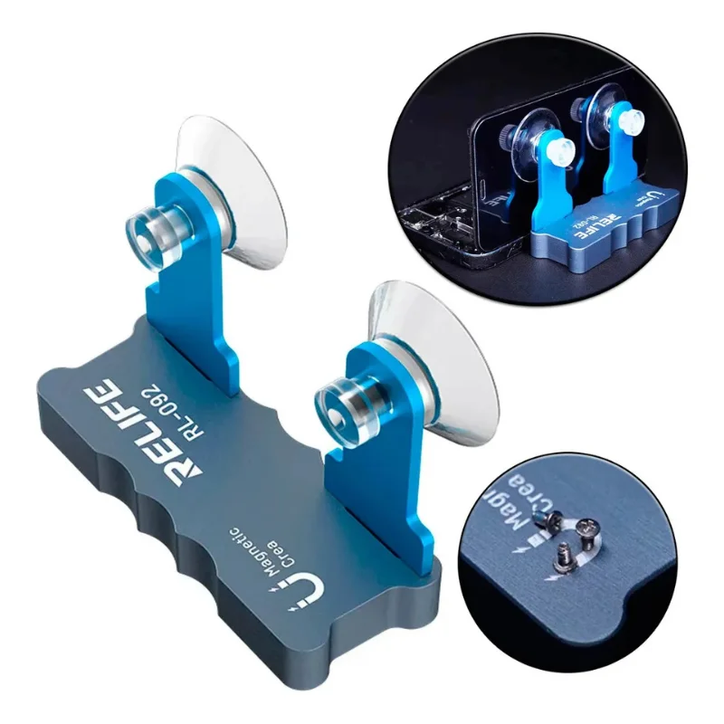 El soporte para reparación celular RELIFE con sujeción de pantalla está diseñado para sujetar de forma estable el equipo y la pantalla mientras el dispositivo se encuentra desarmado, facilitando tareas de diagnóstico, prueba y reparación. Permite mantener la pantalla sostenida y visible durante el trabajo, lo que resulta ideal para verificar funcionamiento, realizar mediciones, revisar flex y conectores, o continuar con la reparación sin riesgo de movimientos involuntarios. Su estructura brinda una base firme para el celular y un sistema de sujeción de pantalla que mejora la comodidad y la precisión del técnico, reduciendo el riesgo de daños durante el proceso. Herramienta pensada para uso general en taller, no limitada a una reparación específica, y especialmente útil en trabajos donde es necesario operar el equipo abierto.
