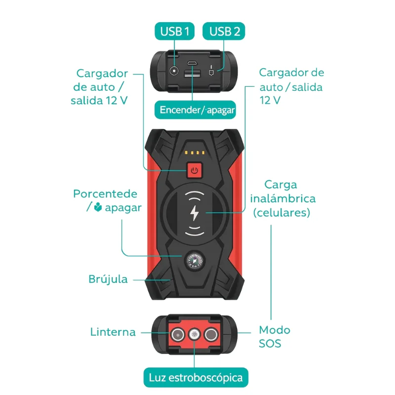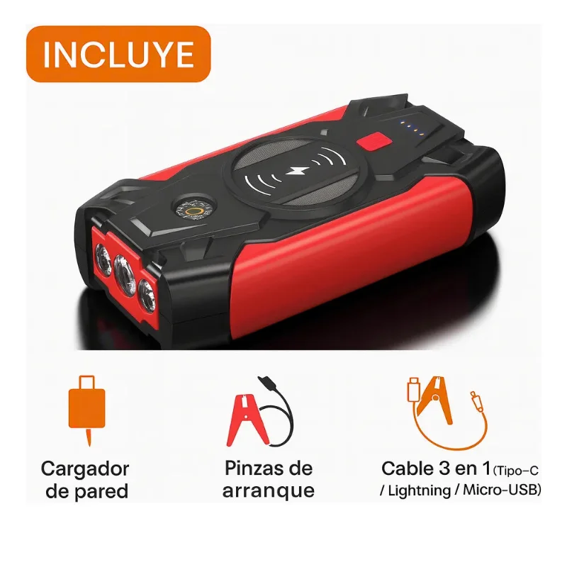 Arrancador de autos multifunción con batería de 39800 mAh, ideal para emergencias y viajes. Este dispositivo combina varias funciones en un solo equipo: arrancador de vehículos, compresor de aire, power bank con carga rápida y carga inalámbrica QI 10W, linterna LED y brújula. Su diseño portátil y completo lo hace indispensable para tener siempre en el auto.