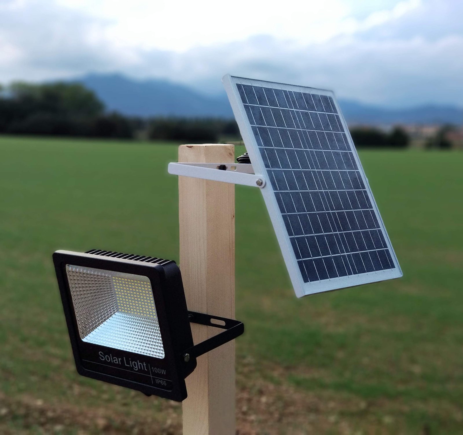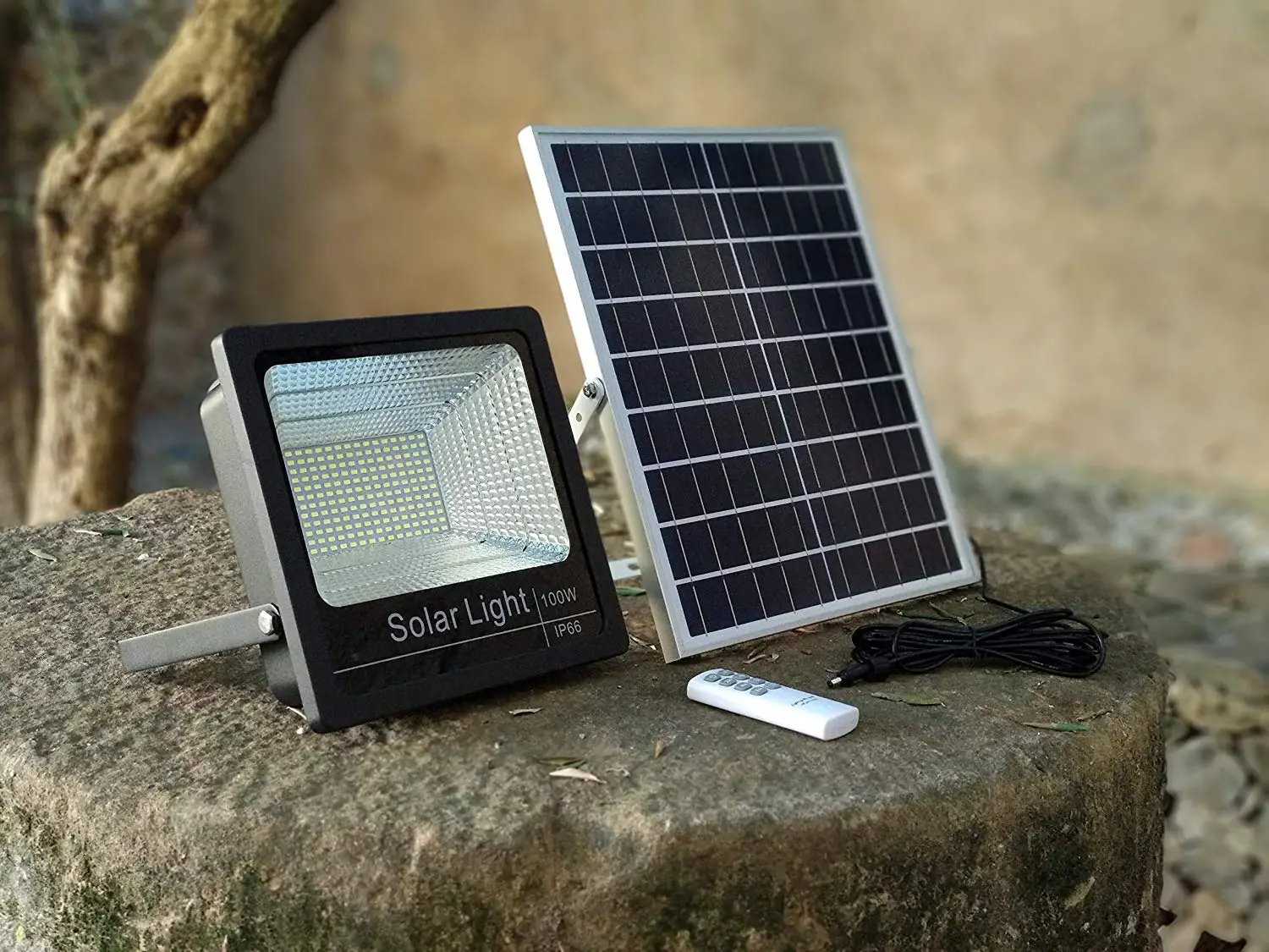 Foco solar led 100w fotocélula con controlFoco solar led, con encendido automático durante el día, control de intensidad, IP66 (para exteriores) permite seleccionar el tiempo de encendido, manualmente (3hrs, 5hrs, 8hrs) con control remoto.