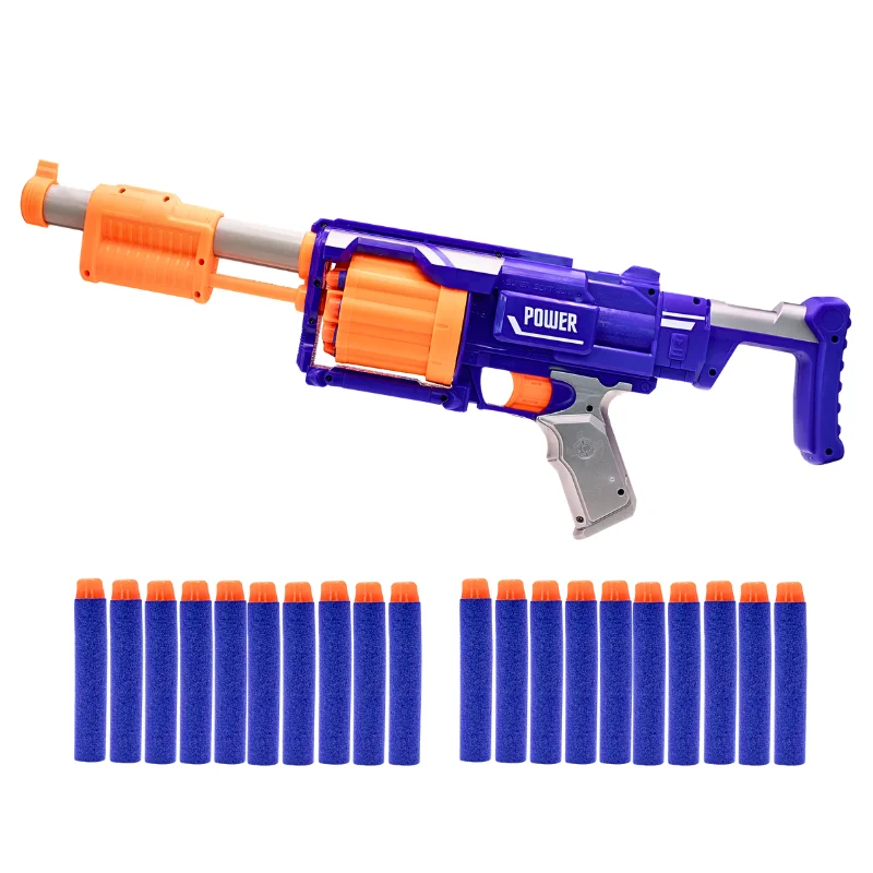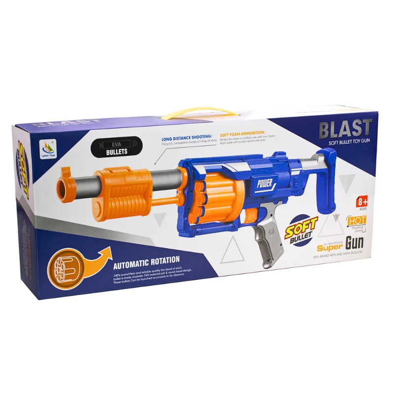 Juguete lanzador de dardos de espuma diseñado para juegos seguros y divertidos tanto en interiores como en exteriores. Su tambor giratorio permite cargar y lanzar dardos de manera continua, ideal para actividades recreativas y competencias amistosas entre niños y adultos.